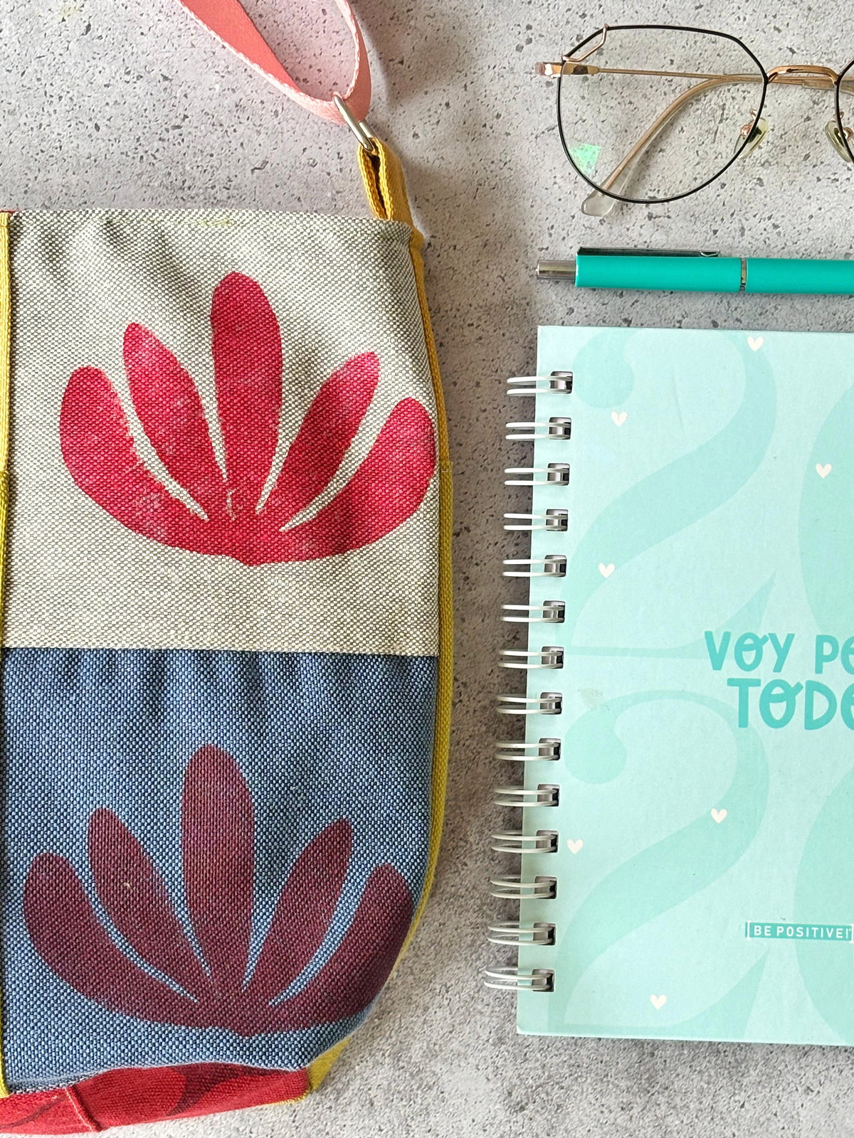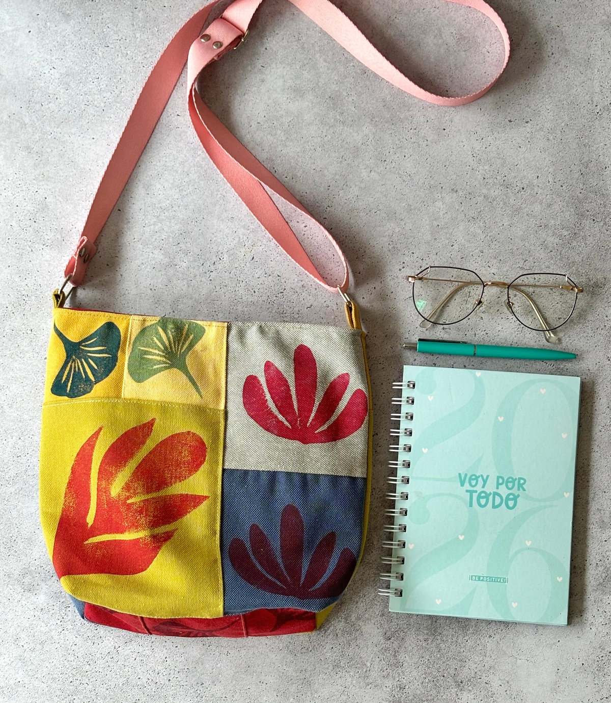 De tela, liviana y cómoda para llevar cruzada o como quieras, con cierre de broche imán para el uso cotidiano.